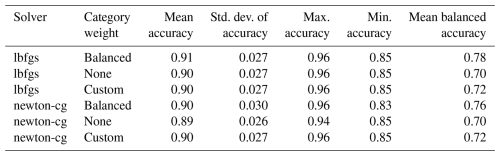 Pedregosa, F.., Varoquaux, G., Gramfort, A., Michel, V., Thirion, B., Grisel, O., Blondel, M., Prettenhofer, P., Weiss, R., Dubourg, V.., Vanderplas, J., Passos, A., Cournapeau, D., Brucher, M., Perrot, M., and Duchesnay, E.: LogisticRegressionCV, https://scikit-learn.org/stable/modules/generated/sklearn.linear_model.LogisticRegressionCV.html#sklearn.linear_model.LogisticRegressionCV (last access: 17 March 2025), 2011b. a