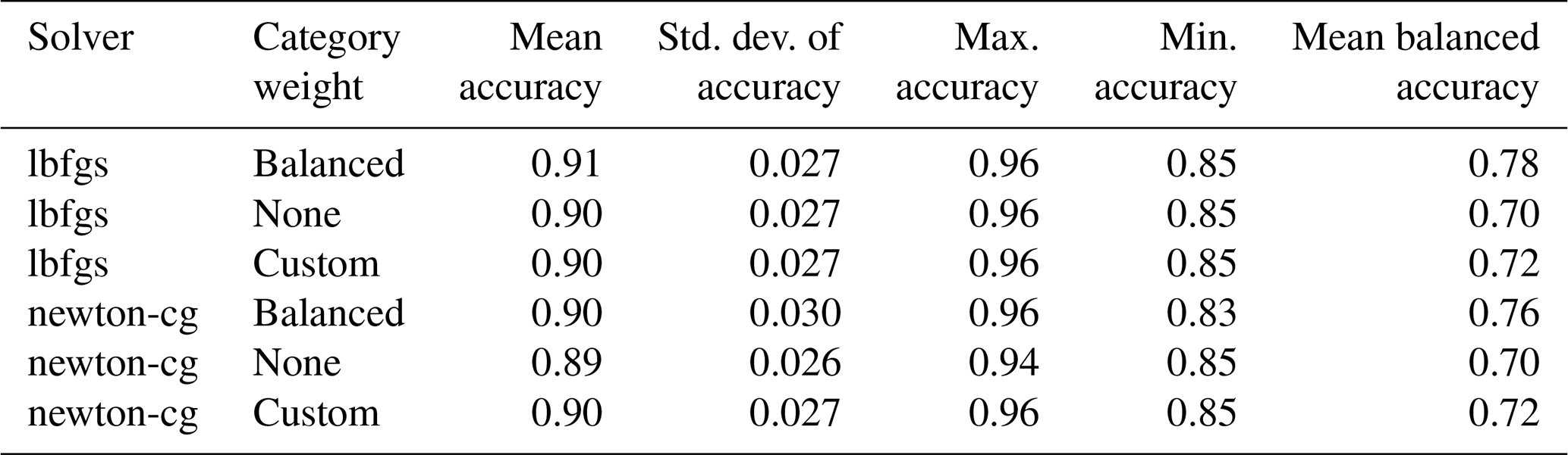 Table 1Model configuration accuracy metrics across the six model configurations. Model configurations include the combination of solver and category weight options (rows), and accuracy metrics (columns) include the mean, standard deviation, maximum, and minimum for prediction accuracy, and mean balanced accuracy for the 20 model iterations (different random training and testing data splits) within each configuration. The first row shows the best-performing model configuration.