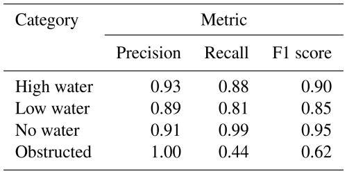 The model configuration with the lbfgs solver and balanced category (class) weights performed best across the 20 model runs, with a mean prediction accuracy of 91 % and a mean balanced accuracy of 78 % (Table 1). In general, the mean balanced accuracy was lower than the mean prediction accuracy for each model configuration due to lower recall for the “obstructed” category compared to the other categories, resulting from a smaller training and test set size for the “obstructed” category. These performance metrics represent model performance evaluated on the testing set; we compare model predictions of flow states generated from both labeled and unlabeled images to stage and discharge measurements in Sect. 3.3.