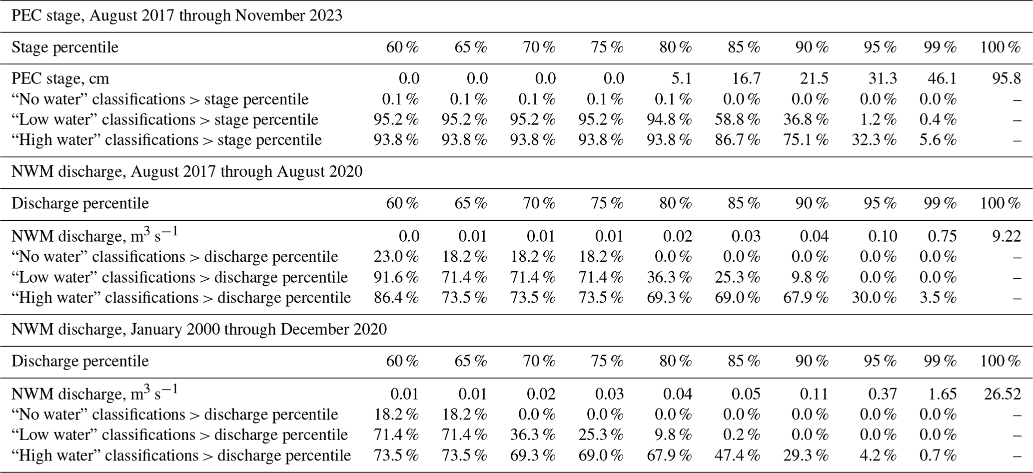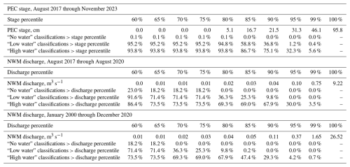 Table A1Percentages of images classified as no, low, and high water that correspond to stage or discharge greater than: percentiles of observed stage at Perry Creek (PEC) from August, 2017 through November, 2023 (top); National Water Model (NWM) discharge at a stream segment overlapping PEC from August, 2017 through August, 2020 (middle); and NWM discharge from January, 2000 through December, 2020 (bottom). All percentages were calculated using the same medium- and high-confidence image classifications from August, 2017 through November, 2023. For NWM data, only image classifications from 2017–2018 are used because there is no NWM data after 2020, and there are no images available during 2019 and 2020.