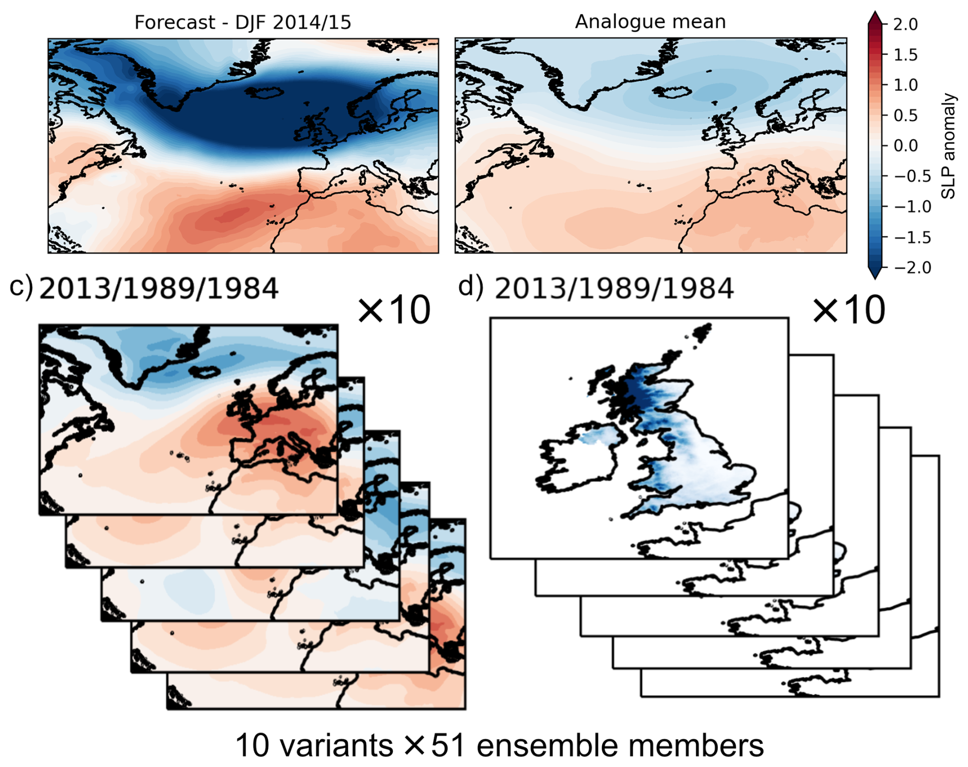 Figure 2Schematic outlining the Historic Weather Analogues method for an example winter (2014/2015). Panel (a) shows GloSea forecast of standardised sea level pressure (SLP) anomalies over winter 2014/2015. Panel (b) shows the mean SLP anomalies across all 510 historical weather analogues ensemble members. Panel (c) shows the SLP anomalies of five example analogue variants where each variant is made up of three months from different historical years (i.e. December 2013/January 1989/February 1984). Panel (d) shows the average rainfall across the UK from the five example analogue variants. The analogue sampling contains ten analogue variants per ensemble member and is repeated for each of the 51 ensemble members of GloSea5 with a total of 510 analogue forecasts.