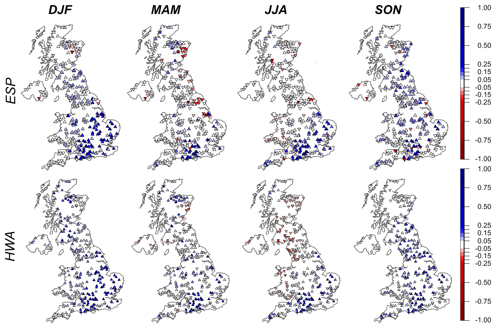 Figure 3Probabilistic hindcast skill for the ESP (top) and HWA (bottom) methods across the hindcast period (1993–2016) for 314 UK catchments. The metric used is the CRPSS, and is calculated for the hindcast period by comparing HWA and ESP with benchmark climatology (retrospective simulation) per season. Blue colours indicate the historic weather analogues method has higher skill than the benchmark climatology (red colours show the historic weather analogues method is worse than climatology). White colours indicate neutrally skilful forecasts. The direction of the symbol indicates the sign of the respective skill score.