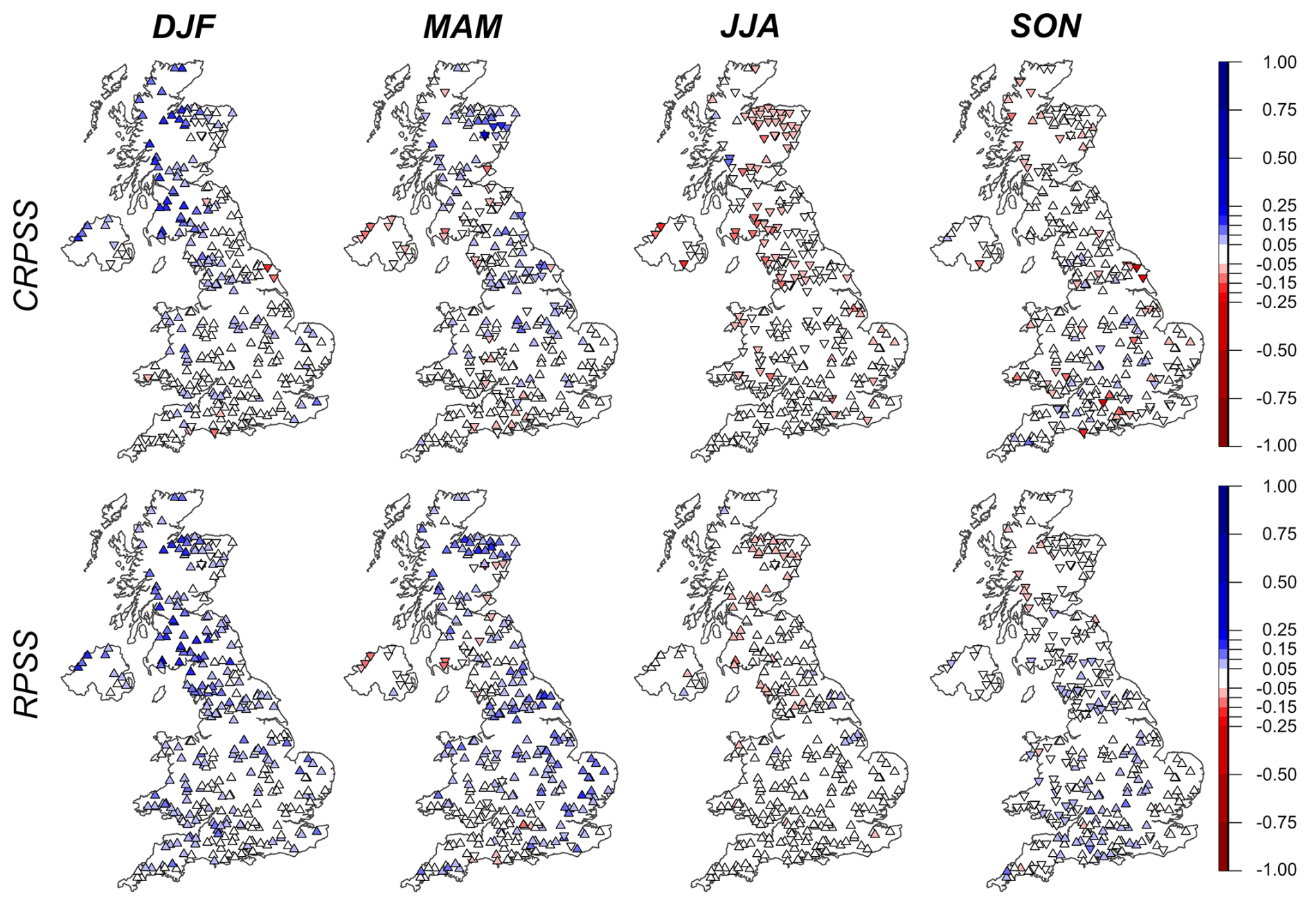 Figure 4Difference in skill levels between the HWA and ESP methods. HWA CRPSS (top) and RPSS (bottom) are shown for the hindcast period (1993–2016) for each season across 314 UK catchments. Blue colours indicate the HWA method is better than the Ensemble Streamflow Prediction (ESP), red colours show the HWA method is worse than ESP. White colours indicate comparative skill between the two methods. The direction of the symbol indicates whether the HWA skill is better (upward arrow) or worse (downward arrow) than benchmark climatology according to CRPSS and RPSS.