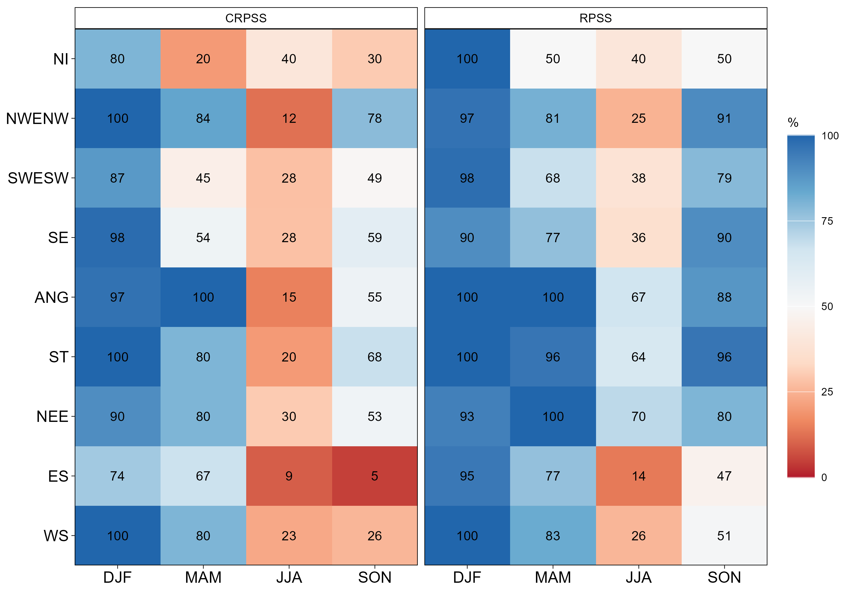 Figure 5Percentage of catchments with positive CRPSS (left) RPSS (right) values calculated from comparing the HWA forecasts against the standard ESP forecasts for each season and each hydroclimate region. The percentage number is shown for each region and season. Regions with more than 50 % of catchments showing improvement are shaded in blue colours whereas regions with less than 50 % of catchments showing improvement is shaded by red colours.