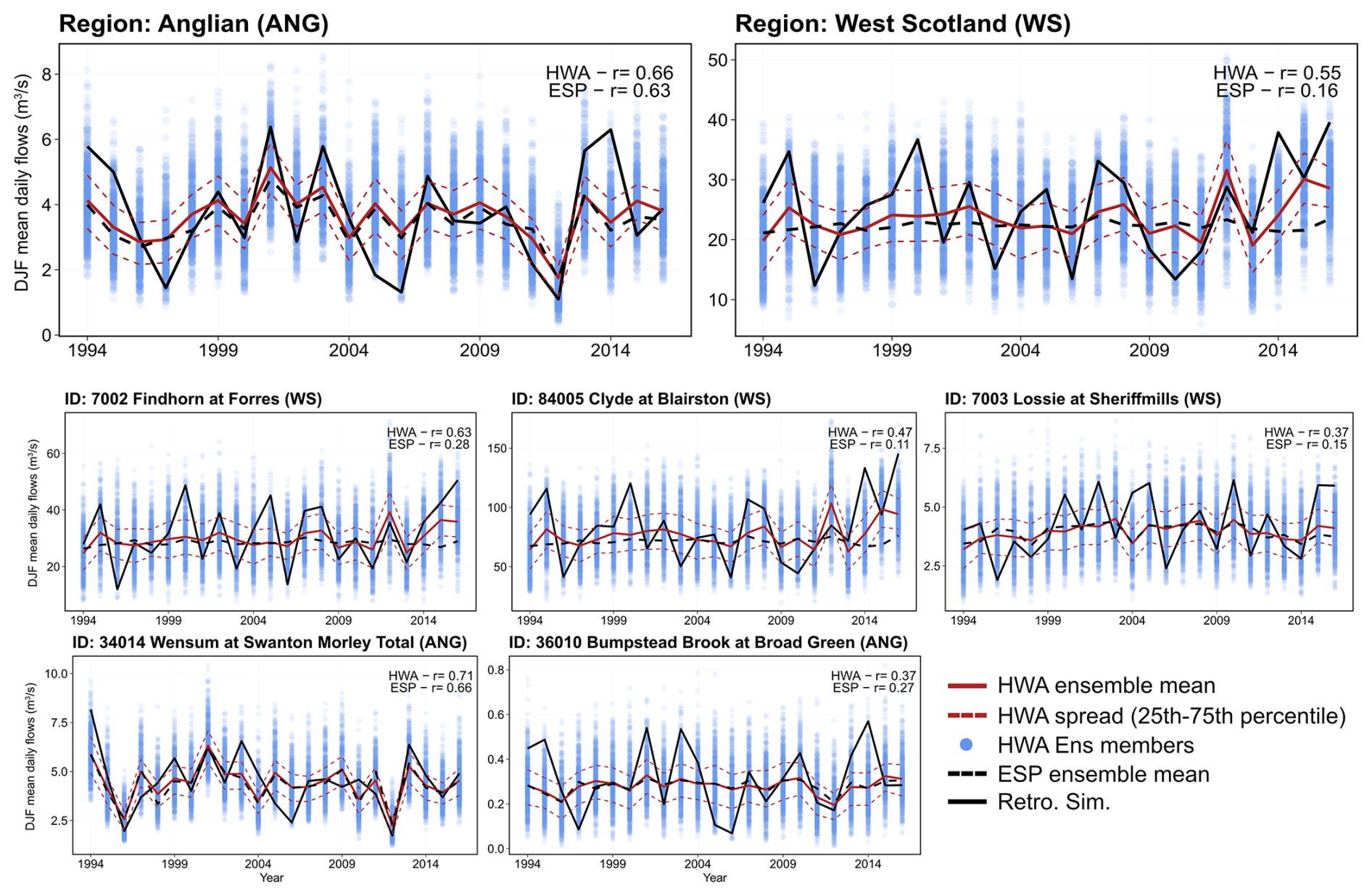 Figure 6December–January–February (DJF) mean daily simulated flows (m3 s−1) averaged across catchments in two contrasting regions (West Scotland and Anglian) and for five individual example catchments with varying skill in each region. Blue dots show the individual ensemble members from the HWA method, the red solid line shows the HWA ensemble mean, the red dotted lines show the HWA spread (25th–75th percentile), the dotted black line shows the ensemble mean of the standard ESP method and the solid black line shows retrospective simulated river flows. The correlation coefficients between the retrospective simulated river flows and the ensemble mean HWA and ESP forecasts are shown on each plot.