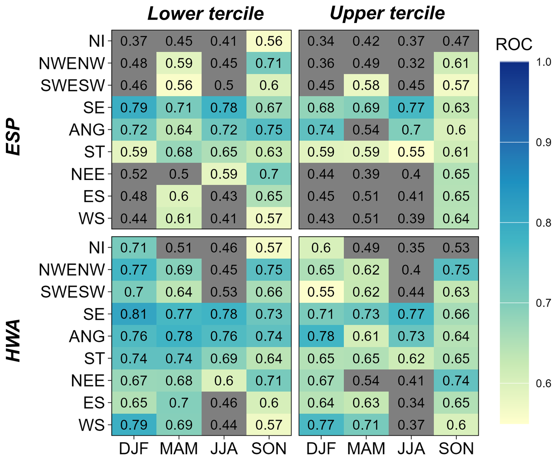 Figure 7 shows the skill for both methods in discriminating between events (upper or lower tercile river flows) and non-events (middle tercile river flows) for all seasons across each hydroclimate region, showing broadly consistent regional patterns with the CRPSS and RPSS results above. During winter, the HWA method results in more catchments with good skill (ROC score > 0.6) in discriminating both low and high flows across all regions compared to the standard ESP where good skill was only seen for regions in the southeast. ROC scores for catchments in southern England (i.e. SE and ANG regions) are comparable between the two methods for both high and low flow events with clear improvement in skill for all other regions, specifically those in Northeast England and Scotland (WS and ES). Across all considered catchments, skilful discrimination of low flow events in winter is achieved for 41 % of catchments using ESP and 88 % of catchments with the HWA method, while skilful discrimination of high flow in winter is achieved for 35 % of catchments with ESP and 72 % with HWA. In spring, the HWA method generally shows skilful discrimination of high and low flow events in most regions, except for low flows in NI where skill deteriorated compared to ESP. ROC scores for other seasons are similar between ESP and HWA with some regions showing slight deterioration. Skill is particularly low across summer months for both ESP and HWA, highlighting that skill in discriminating low and high flows in summer remains a particularly notable challenge. Some regions saw a reduction in skill in summer with HWA compared to ESP (e.g. NI, ES and WS for high flows).