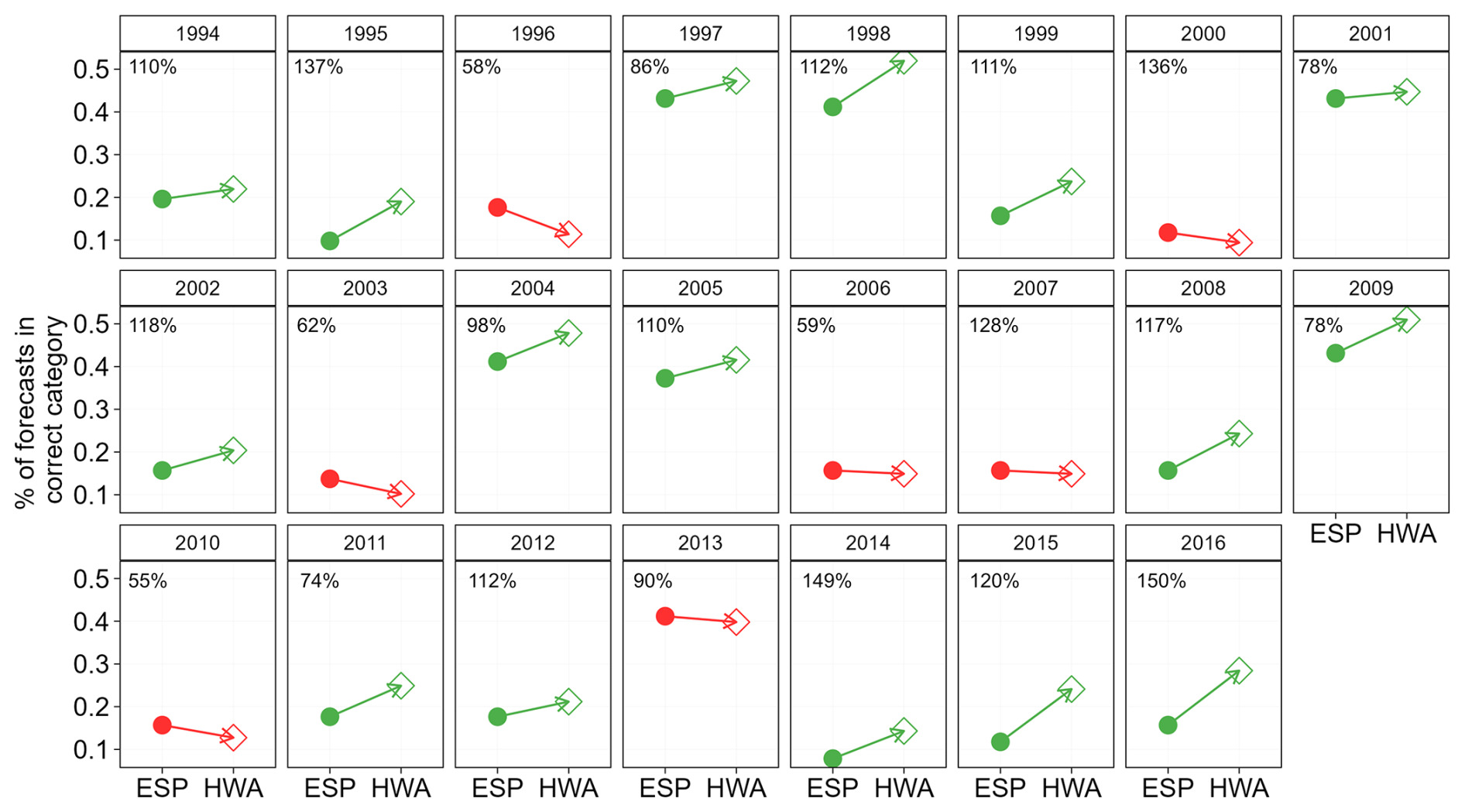 Figure 8Change in the fraction of DJF forecasts in the correct category (compared to the retrospective simulation) averaged across catchments in Scotland. Dots on the left show the standard ESP method, diamonds on the right show the HWA method. Green arrows indicate years with an improvement in the forecasts with the HWA method, red arrows indicate a decrease in forecast performance. Rainfall as a percentage of average for each winter is shown on each panel. The year in the title refers to the year of the January and February.