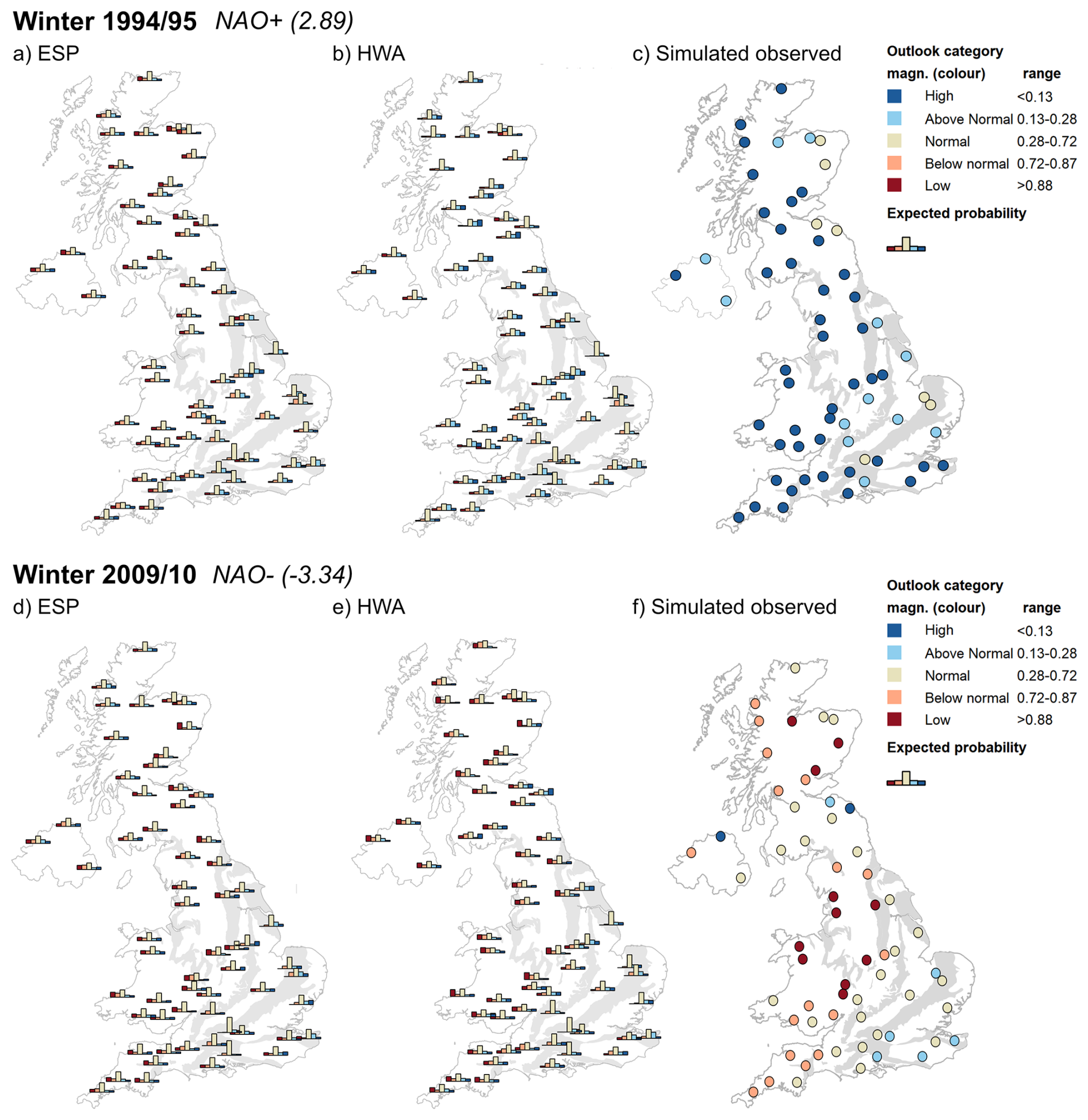 Winter 2009/2010, the third coldest winter for Scotland since 1836, was characterised by a strongly negative NAO- phase and prolonged dry conditions with a marked east-west spatial contrast for rainfall (Prior and Kendon, 2011). Rainfall was notably below average across western UK with some areas receiving less than half the average (Kendon et al., 2013). The winter was a precursor to the multi-year 2010–2012 drought, which began with widespread below normal winter river flows across western Britain (Marsh et al., 2013). Both the ESP and HWA hindcasts for river flows indicate a higher likelihood of below-normal to low river flows across the UK, agreeing well with what was observed. While the spatial pattern from both methods were broadly similar, the likelihood of low river flows is heightened in the HWA method for most catchments compared to ESP. This further illustrates results from the skill scores showing the improved ability of the HWA method to discriminate between both high and low flow events.