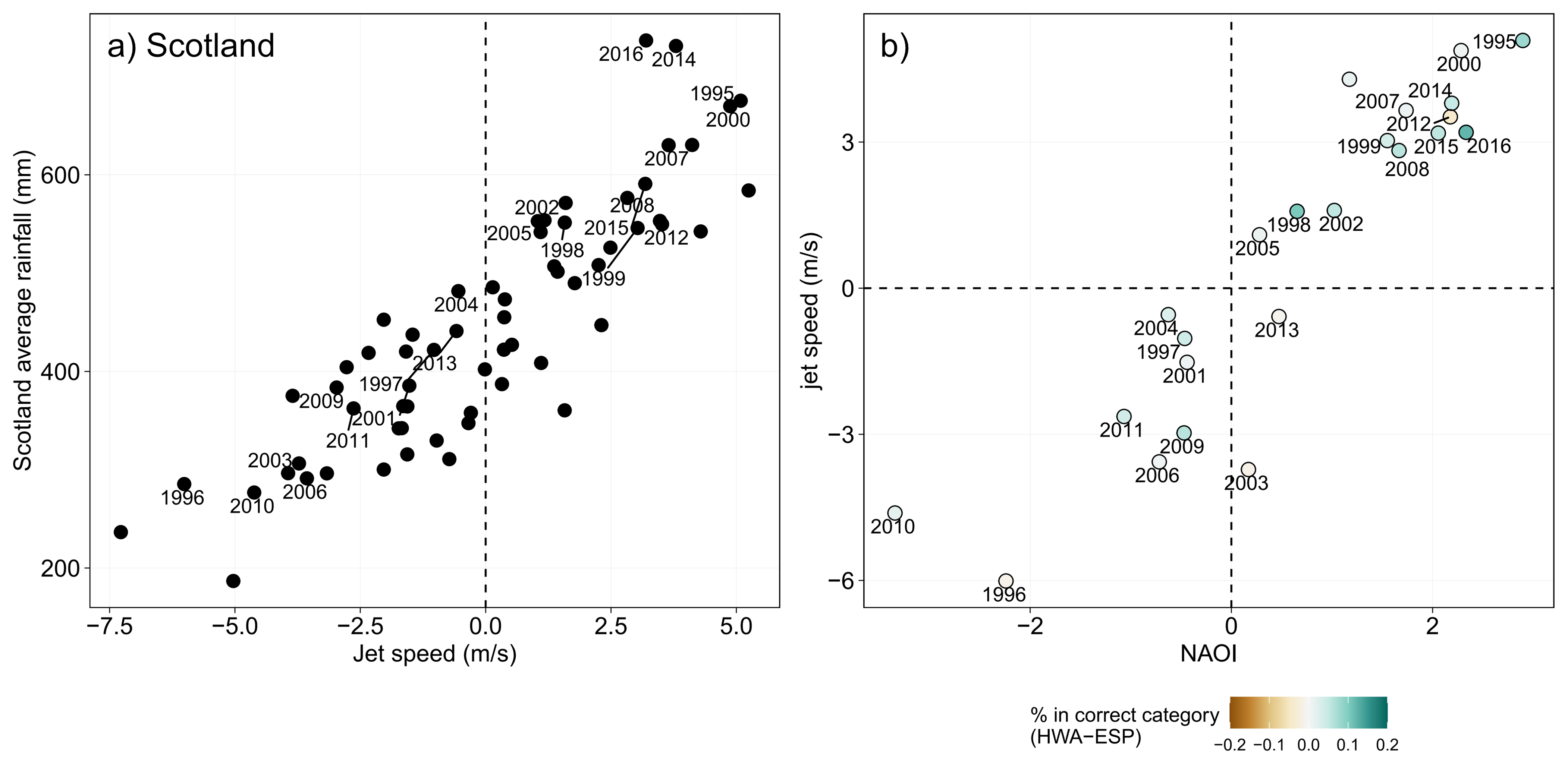 Figure 10Linking winter river flow predictability to atmospheric circulation patterns. (a) Scotland average rainfall against mean winter North Atlantic jet speed (m s−1) for 1956–2018, with the years in the hindcast period highlighted. Panel (b) shows jet speed (m s−1) against the North Atlantic Oscillation (NAO) index, with the dots coloured by the percentage of HWA forecasts in the correct category as the retrospective simulation minus the percentage of ESP forecasts in the correct category as the retrospective simulation averaged across catchments in Scotland for all years in the hindcast period – positive values indicate a higher percentage of forecasts in the correct category in HWA compared to ESP.