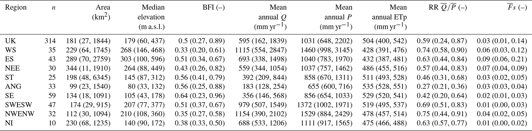 Table 1Summary statistics of the 314 selected catchments for the UK across nine hydroclimate regions. The range given for each catchment characteristic is the 5th and 95th percentile across catchments in each region. Catchment characteristics are retrieved from the UK National River Flow Archive (NRFA). RR is runoff ratio and Fs is fraction of precipitation falling as snow (across hydrological years 1983–2014). Reproduced with permission from Harrigan et al. (2018).