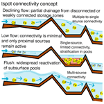 In order to interpret the event-scale hydrodynamics in our system, a conceptual basis is needed as flow response analyses alone do not fully capture the mechanistic processes that govern the supply of solutes to flowing waters. Observing C–Q dynamics through a connectivity-mediated lens (Fig. 2a) enables the identification of episodic transitions and characteristics that extend beyond general percolation and link to chemostatic and chemodynamic behaviors. Such transitions are best understood through the fill-and-spill concept in which water accumulates in isolated pools until a threshold is reached, after which overflow activates previously disconnected pathways (McDonnell et al., 2021). In our mine system, this behavior is further influenced by lentic-lotic cycling, where solute accumulation occurs during lotic channelized low flow conditions that maintain prolonged contact with metal-rich surfaces, followed by a transition to lentic, stratified pooling as water backs up behind internal thresholds. When these lentic layers spill, connectivity is abruptly re-established and stored solutes are rapidly flushed from the system, generating short-lived mobilization events (Schmadel et al., 2018). Depending on timing and degree of connectivity, these activation events may or may not coincide with elevated contaminant loads.