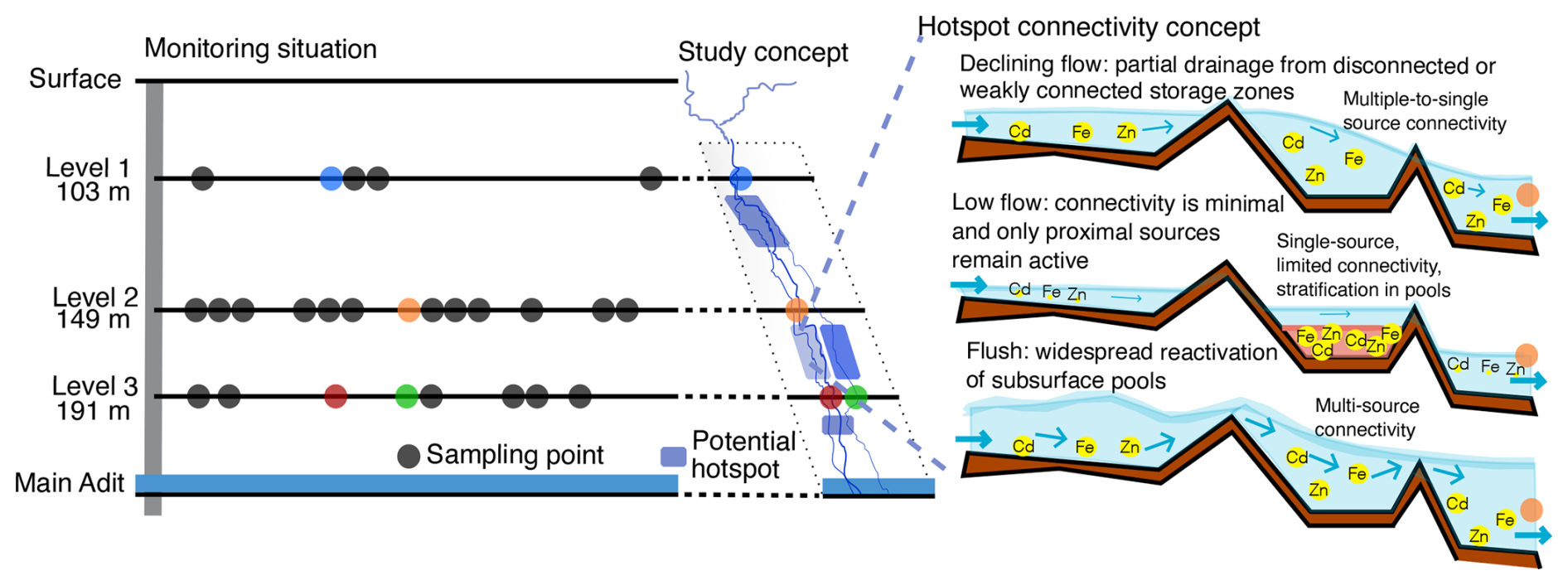 Despite visible surface effects, the contaminant sources and pathways within abandoned underground mines remain largely obscured due to limited accessibility. Seeping waters infiltrate the mining system through complex pathways along underground waste rock deposits. While percolating or flowing through a fractured system of pools and pathways, waters dissolve and transport various elements. This suggests that pollution is not created continuously and diffuse but instead governed by discrete, intermittent and dynamically connective pathways. With hydrologic connectivity (Freeman et al., 2007) and intermittency (Fovet et al., 2021) known to impose specific characteristics on water-mediated transport and turnover in soil and other environments (Turnbull et al., 2018), the hydrological processes underlying contaminant mobilization and dispersal in abandoned mines may be better described using the tools and concepts of fill-and-spill (McDonnell et al., 2021) or lotic-lentic cycles (Schmadel et al., 2018).