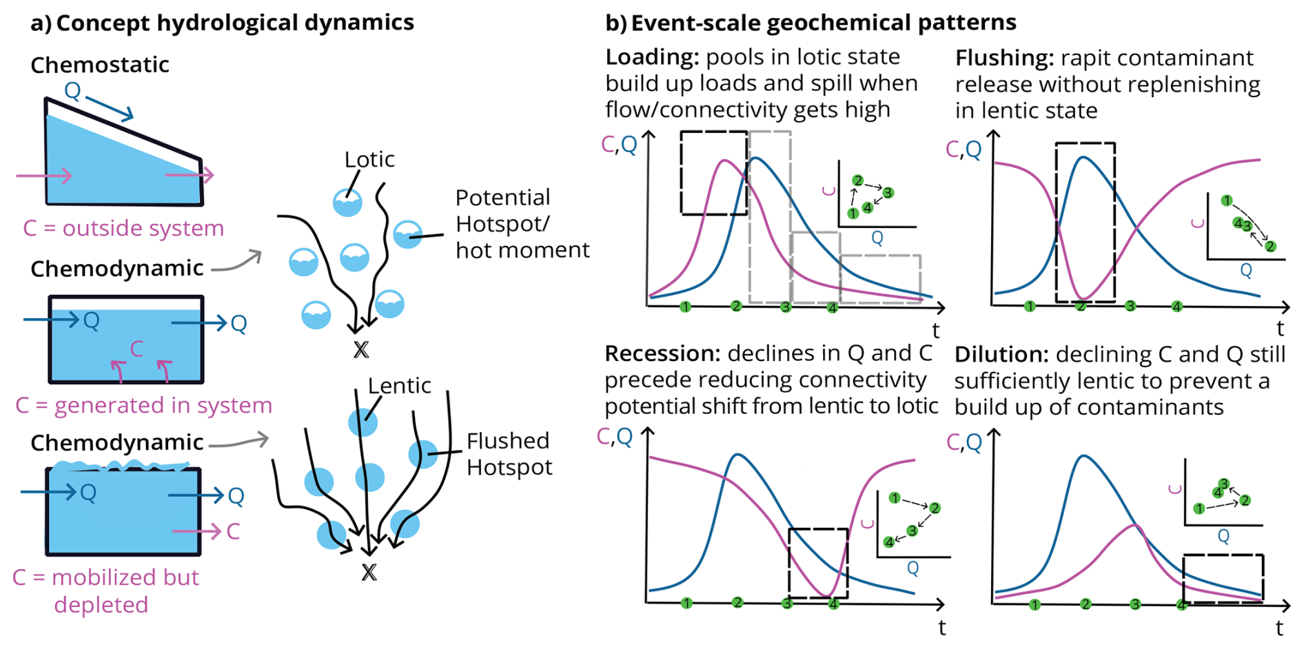 Figure 2(a) Conceptual representation of source and pool behavior with three dominant solute conditions. (1) External source input, where concentrations (C) remain constant across a range of flows (Q). (2) Internal generation, where solutes accumulate within isolated or weakly connected pools (e.g., lotic compartments). (3) Depleted pools, where previously enriched water masses are mobilized but concentrations progressively decline as storage is exhausted. (b) Event–scale co-evolution of concentration and discharge. Time-series patterns show loading, flushing, dilution, and recession patterns emerge during an event. Dark dotted box regions highlight time windows in which the certain behavior is observed. Light dotted box regions in the first C–Q plot are shown to acknowledge that other behaviors may also be present throughout different time points. Consecutive observations (green points) illustrate how these patterns evolve through a hydrological event, and these transitions reflect the interplay of fill-and-spill activation, lentic-lotic switching, and the spatial distribution of internal solute reservoirs. Together, these panels illustrate how event-driven changes in connectivity and solute availability produce contaminant export behavior, including short-lived hotspots and hot moments.