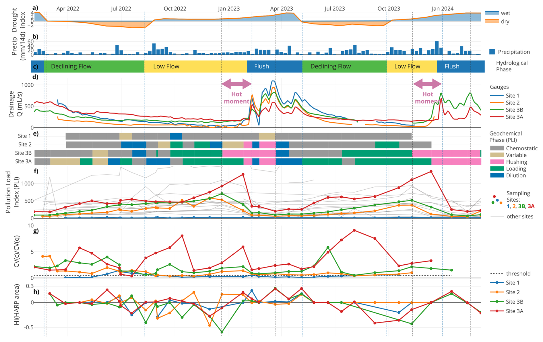 Figure 3Water and metal transport regime in the Reiche Zeche mine. (a) Dryness index as an indicator of the general water situation on the surface. (b) Weekly precipitation collected from Reiche Zeche, Freiberg weather station. (c) Hydrologically defined flow phases. (d) Discharge at the four sites in the Reiche Zeche mine. Pink arrows represent time periods when hot moments occur. (e) Geochemical hysteresis phases of pollution load index (PLI) at the four sites. Recession phase is not shown since it was not identified in the analysis. (f) PLI dynamics, (g) ratios (with a threshold of 0.5), and (h) Hysteresis Area from the HARP method are shown across the mine system. Individual sites are connected by black lines and colored lines are monitored flow sites for sites 1, 2, 3A, and 3B.