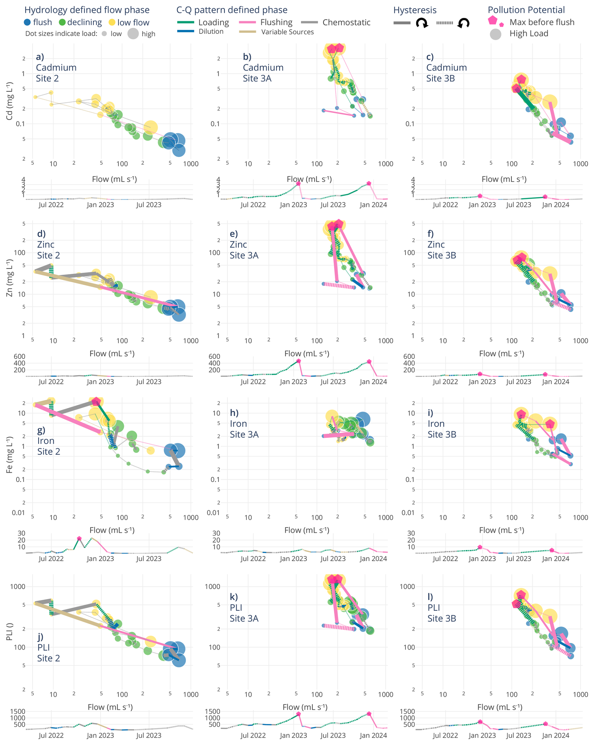 Figure 5Concentration–discharge (C–Q) relationships (log10 scaled) for (a–c) dissolved Cd, (d–f) dissolved Zn, (g–i) dissolved Fe, and (j–l) Pollution Load Index at Site 2 (a, d, g, j), Site 3A (b, e, h, k) and Site 3B (c, f, i, l) during the three hydrologically defined phases (flush – blue, declining – green, and low – yellow). Bright pink pentagon-shaped points are the main pollution points (i.e., moments when high contaminant potential and high load is identified). Dot size represents the respective load. Under each C–Q plot, the dissolved metal concentration and PLI values are shown across a time scale. The geochemically defined phase from the C–Q patterns is represented through the color of the lines connecting each point for the C–Q plots with the line thickness corresponding to absolute hysteresis index (Zuecco et al., 2016) and is distinguished by its direction (negative or near-zero HI dashed, positive HI solid). This phase distinction is also shown for the time series with marked main pollution points.