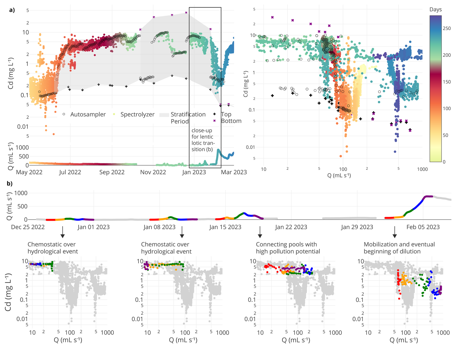 To complement this integrative view from the tri-weekly sampling and to zoom into the transition from loading to mobilization, we applied high-frequency monitoring with an in-situ UV-Vis spectrometer (collecting hourly measurements) and daily autosampling at site 2. At site 2, a drainage channel with rough bottom structure creates a specific dynamic flow environment where stratification, density contrasts, and throughflow coexist (Sanchez et al., 2025). This setting created a labile 2-phase system: a low-density surface layer forming a hydraulically connected stream above a dense, metal-enriched bottom pool. Such dual compartments acted as both storage and release zones, with stratification intermittently buffering and then abruptly mobilizing contaminants. To capture these dynamics, we combined autosampler-based laboratory measurements with high-frequency spectrometric estimates of dissolved Cd (Fig. 6). This dual approach revealed that transitions from solute accumulation to flushing occurred within hours and much more rapid than what can be resolved by sampling alone, highlighting short-lived but significant windows of contaminant export.